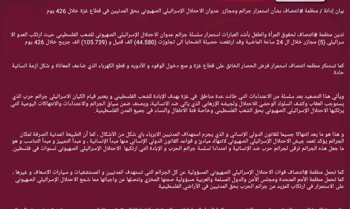 بيان إدانة / منظمة #انتصاف بشأن استمرار جرائم ومجازر عدوان الاحتلال الإسرائيلي الصهيوني بحق المدنيين في قطاع غزة خلال 426 يوم
