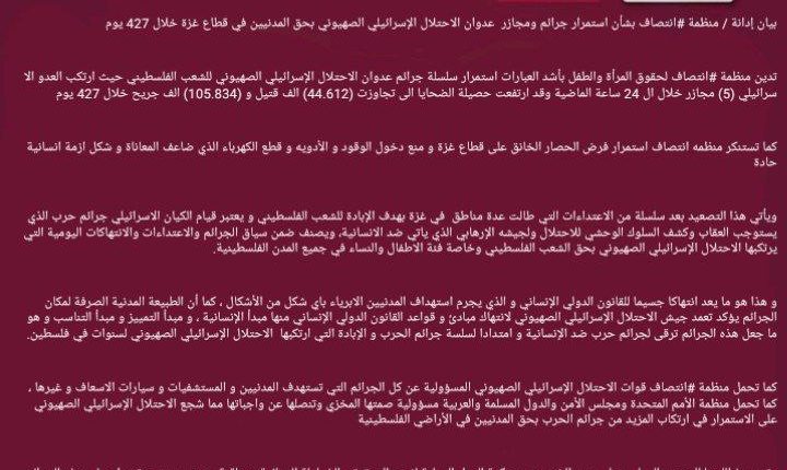 بيان إدانة / منظمة #انتصاف بشأن استمرار جرائم ومجازر عدوان الاحتلال الإسرائيلي الصهيوني بحق المدنيين في قطاع غزة خلال 427 يوم