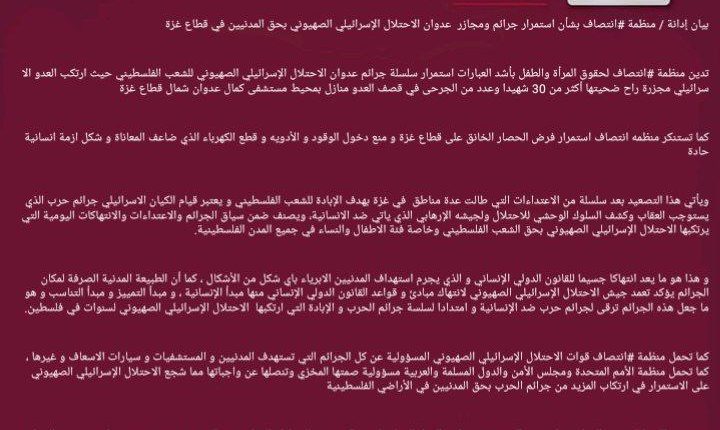 بيان إدانة / منظمة #انتصاف بشأن استمرار جرائم ومجازر عدوان الاحتلال الإسرائيلي الصهيوني بحق المدنيين في قطاع غزة