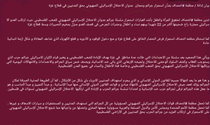 بيان إدانة / منظمة #انتصاف بشأن استمرار جرائم ومجازر عدوان الاحتلال الإسرائيلي الصهيوني بحق المدنيين في قطاع غزة
