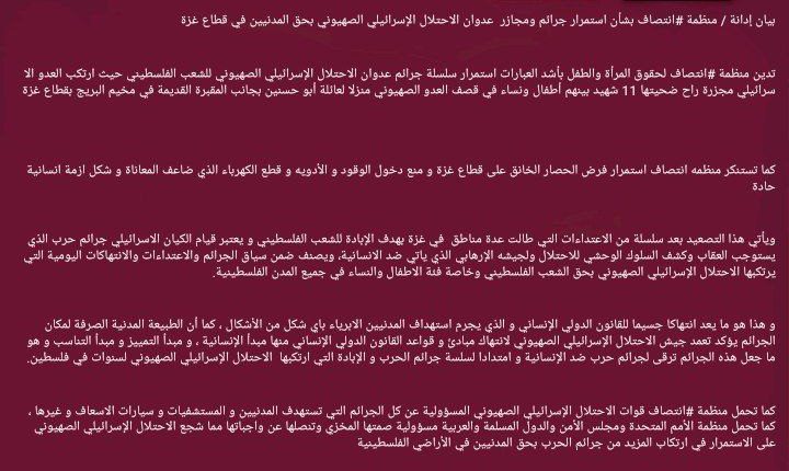 بيان إدانة / منظمة #انتصاف بشأن استمرار جرائم ومجازر عدوان الاحتلال الإسرائيلي الصهيوني بحق المدنيين في قطاع غزة