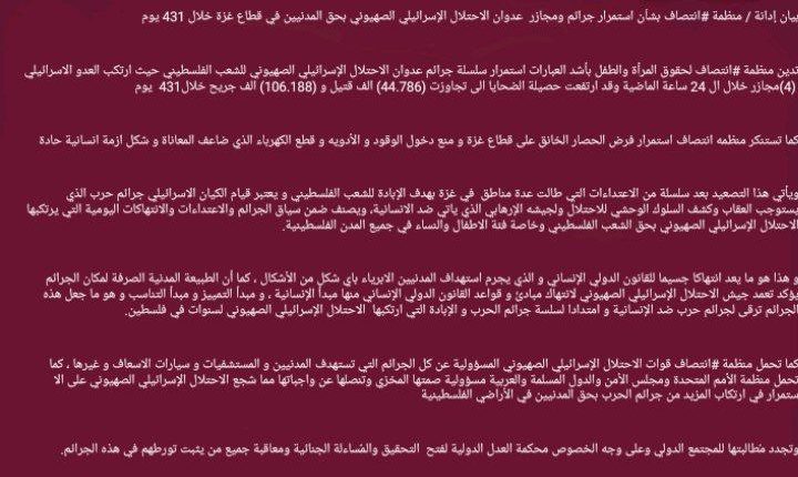 بيان إدانة / منظمة #انتصاف بشأن استمرار جرائم ومجازر عدوان الاحتلال الإسرائيلي الصهيوني بحق المدنيين في قطاع غزة خلال 431 يوم