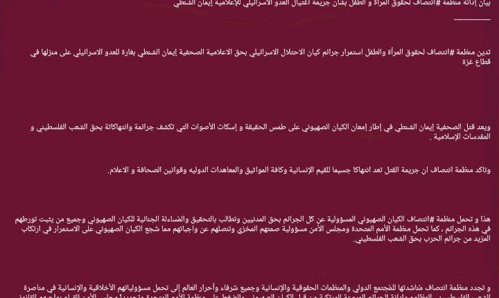 بيان إدانة منظمة #انتصاف لحقوق المرأة و الطفل بشأن جريمة اغتيال العدو الاسرائيلي للإعلامية إيمان الشنطي