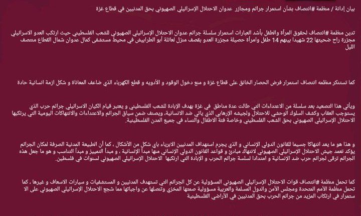 بيان إدانة / منظمة #انتصاف بشأن استمرار جرائم ومجازر عدوان الاحتلال الإسرائيلي الصهيوني بحق المدنيين في قطاع غزة