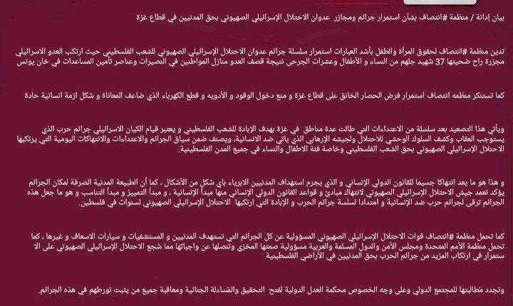 كما تدعو المنظمات الحقوقية والإنسانية وجميع الدول المسلمة والعربية و شرفاء وأحرار العالم إلى تحمل مسؤولياتهم الأخلاقية والإنسانية في مناصرة الشعب الفلسطيني المظلوم وإدانة الجرائم المروعة المرتكبة من قبل الاحتلال الإسرائيلي الصهيوني والضغط على منظمة الأمم المتحدة وتحديداً مجلس الأمن للقيام بواجبهم القانوني والأخلاقي في حماية المدنيين وإيقاف هذا العدوان المتعمد..