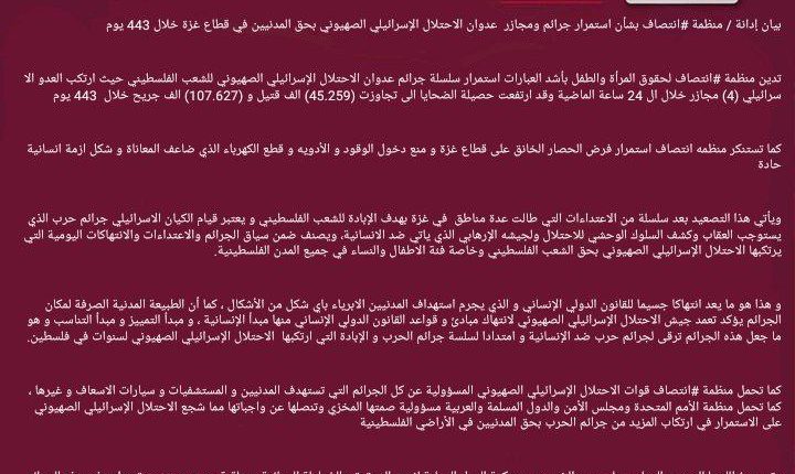 بيان إدانة / منظمة #انتصاف بشأن استمرار جرائم ومجازر عدوان الاحتلال الإسرائيلي الصهيوني بحق المدنيين في قطاع غزة خلال 443 يوم