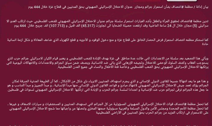 بيان إدانة / منظمة #انتصاف بشأن استمرار جرائم ومجازر عدوان الاحتلال الإسرائيلي الصهيوني بحق المدنيين في قطاع غزة خلال 444 يوم