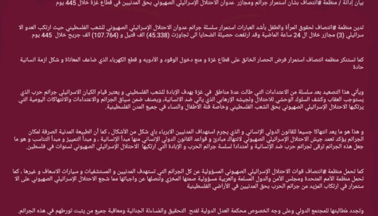 بيان إدانة / منظمة #انتصاف بشأن استمرار جرائم ومجازر عدوان الاحتلال الإسرائيلي الصهيوني بحق المدنيين في قطاع غزة خلال 445 يوم