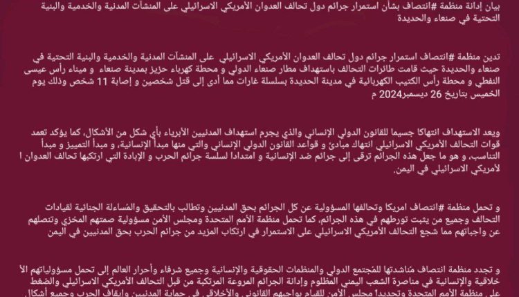 بيان إدانة منظمة #انتصاف بشأن استمرار جرائم دول تحالف العدوان الأمريكي الاسرائيلي على المنشآت المدنية والخدمية والبنية التحتية في صنعاء والحديدة