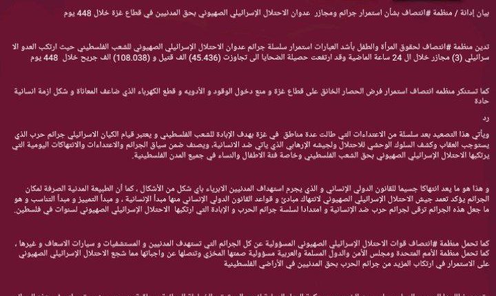 بيان إدانة / منظمة #انتصاف بشأن استمرار جرائم ومجازر عدوان الاحتلال الإسرائيلي الصهيوني بحق المدنيين في قطاع غزة خلال 448 يوم
