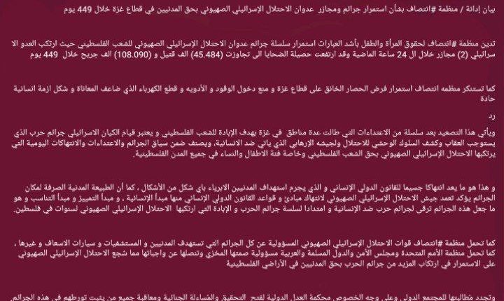 بيان إدانة / منظمة #انتصاف بشأن استمرار جرائم ومجازر عدوان الاحتلال الإسرائيلي الصهيوني بحق المدنيين في قطاع غزة خلال 449 يوم