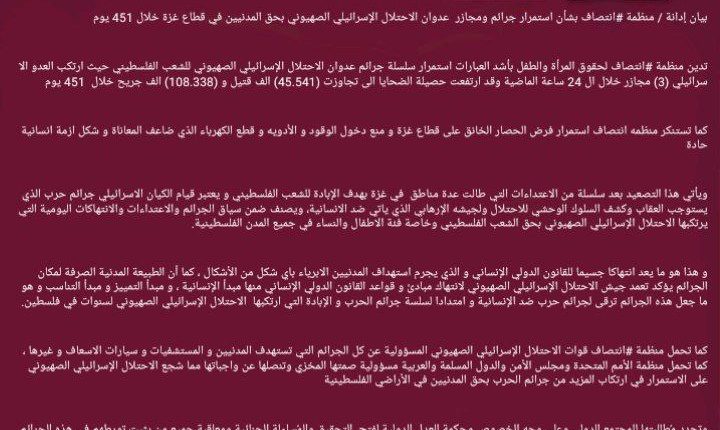 بيان إدانة / منظمة #انتصاف بشأن استمرار جرائم ومجازر عدوان الاحتلال الإسرائيلي الصهيوني بحق المدنيين في قطاع غزة خلال 449 يوم