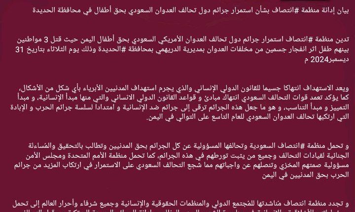 بيان إدانة منظمة #انتصاف بشأن استمرار جرائم دول تحالف العدوان السعودي بحق أطفال في محافظة الحديدة