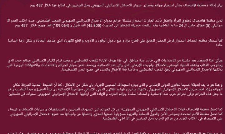 بيان إدانة / منظمة #انتصاف بشأن استمرار جرائم ومجازر عدوان الاحتلال الإسرائيلي الصهيوني بحق المدنيين في قطاع غزة خلال 457 يوم