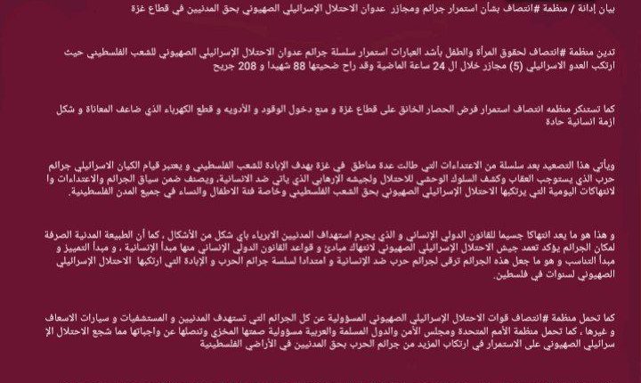 بيان إدانة / منظمة #انتصاف بشأن استمرار جرائم ومجازر عدوان الاحتلال الإسرائيلي الصهيوني بحق المدنيين في قطاع غزة