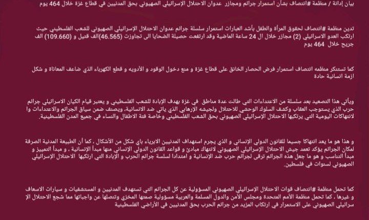 بيان إدانة / منظمة #انتصاف بشأن استمرار جرائم ومجازر عدوان الاحتلال الإسرائيلي الصهيوني بحق المدنيين في قطاع غزة خلال 464 يوم