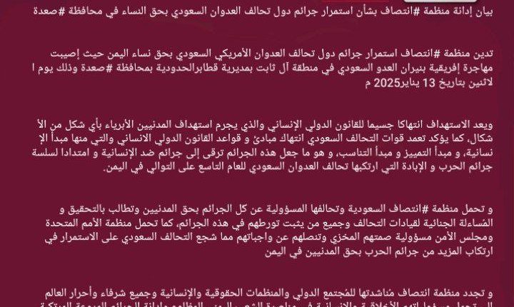 بيان إدانة منظمة #انتصاف بشأن استمرار جرائم دول تحالف العدوان السعودي بحق النساء في محافظة #صعدة