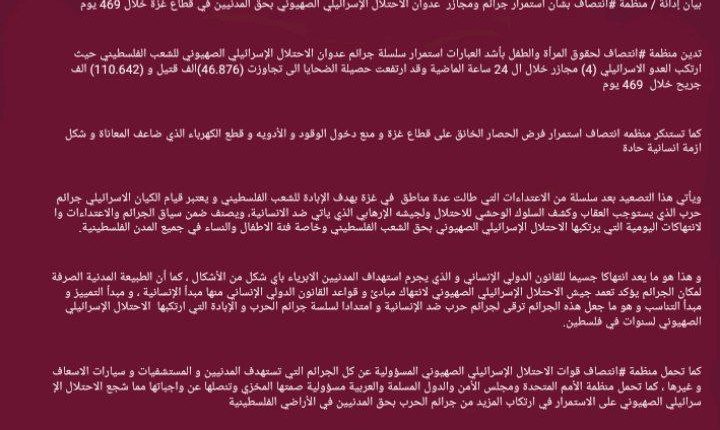 بيان إدانة / منظمة #انتصاف بشأن استمرار جرائم ومجازر عدوان الاحتلال الإسرائيلي الصهيوني بحق المدنيين في قطاع غزة خلال 469 يوم