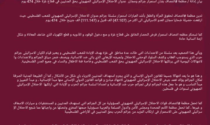 بيان إدانة / منظمة #انتصاف بشأن استمرار جرائم ومجازر عدوان الاحتلال الإسرائيلي الصهيوني بحق المدنيين في قطاع غزة خلال 474 يوم