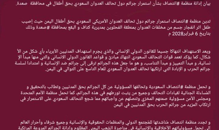 بيان إدانة منظمة #انتصاف بشأن استمرار جرائم دول تحالف العدوان السعودي بحق أطفال في محافظة صعدة .ك