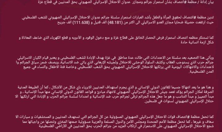 تدين منظمة #انتصاف لحقوق المرأة والطفل بأشد العبارات استمرار سلسلة جرائم عدوان الاحتلال الإسرائيلي الصهيوني للشعب الفلسطيني حيث ارتفعت حصيلة ضحايا مجازر العدو الاسرائيلي الى اكثر من (48.181) الف قتيل و (111.638) الف جريح