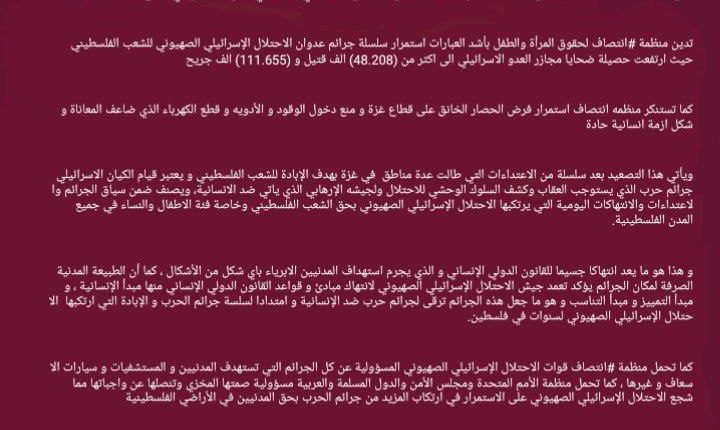 تدين منظمة #انتصاف لحقوق المرأة والطفل بأشد العبارات استمرار سلسلة جرائم عدوان الاحتلال الإسرائيلي الصهيوني للشعب الفلسطيني حيث ارتفعت حصيلة ضحايا مجازر العدو الاسرائيلي الى اكثر من (48.208) الف قتيل و (111.655) الف جريح