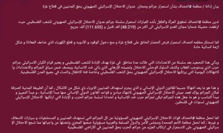 تدين منظمة #انتصاف لحقوق المرأة والطفل بأشد العبارات استمرار سلسلة جرائم عدوان الاحتلال الإسرائيلي الصهيوني للشعب الفلسطيني حيث ارتفعت حصيلة ضحايا مجازر العدو الاسرائيلي الى اكثر من (48.219) الف قتيل و (111.655) الف جريح