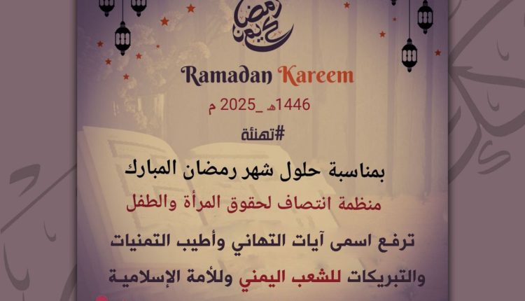 منظمة انتصاف لحقوق المرأة والطفل ترفع أسمى آيات التهاني و اطيب التمنيات و التبريكات للشعب اليمني و للأمة الإسلامية