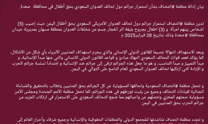 بيان إدانة منظمة #انتصاف بشأن استمرار جرائم دول تحالف العدوان السعودي بحق أطفال في محافظة صعدة .