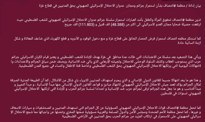 تدين منظمة #انتصاف لحقوق المرأة والطفل بأشد العبارات استمرار سلسلة جرائم عدوان الاحتلال الإسرائيلي الصهيوني للشعب الفلسطيني حيث ارتفعت حصيلة ضحايا مجازر العدو الاسرائيلي الى اكثر من (48.388) الف قتيل و (111.803) الف جريح
