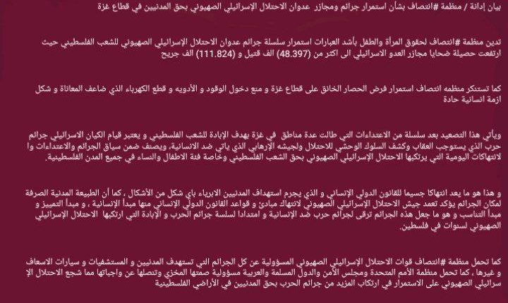 تدين منظمة #انتصاف لحقوق المرأة والطفل بأشد العبارات استمرار سلسلة جرائم عدوان الاحتلال الإسرائيلي الصهيوني للشعب الفلسطيني حيث ارتفعت حصيلة ضحايا مجازر العدو الاسرائيلي الى اكثر من (48.397) الف قتيل و (111.824) الف جريح