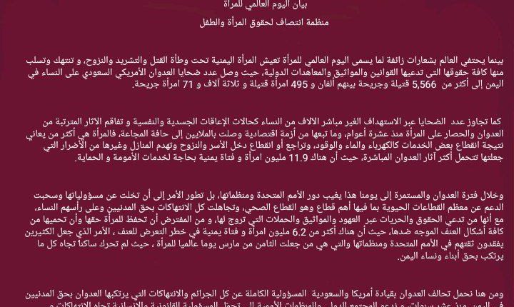بينما يحتفي العالم بشعارات زائفة لما يسمى اليوم العالمي للمرأة تعيش المرأة اليمنية تحت وطأة القتل والتشريد والنزوح، و تنتهك وتسلب منها كافة حقوقها التى تدعيها القوانين والمواثيق والمعاهدات الدولية، حيث وصل عدد ضحايا العدوان الأمريكي السعودي على النساء في اليمن إلى أكثر من 5,566 قتيلة وجريحة بينهم ألفان و 495 امرأة قتيلة و ثلاثة آلاف و 71 امرأة جريحة.