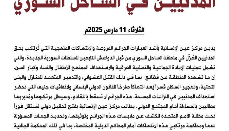 تدين منظمة #انتصاف لحقوق المرأة والطفل بأشد العبارات الجرائم و المجازر الوحشية و الابادة و التصفية ضد المدنيين في الساحل السوري من قبل الجماعات التكفيرية و قتل الالاف من المدنيين بينهم نساء و اطفال و كبار سن