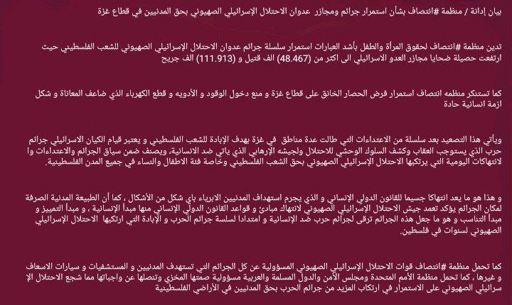 تدين منظمة #انتصاف لحقوق المرأة والطفل بأشد العبارات استمرار سلسلة جرائم عدوان الاحتلال الإسرائيلي الصهيوني للشعب الفلسطيني حيث ارتفعت حصيلة ضحايا مجازر العدو الاسرائيلي الى اكثر من (48.467) الف قتيل و (111.913) الف جريح
