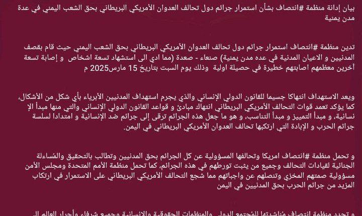 تدين منظمة #انتصاف استمرار جرائم دول تحالف العدوان الأمريكي البريطاني بحق الشعب اليمني حيث قام بقصف المدنيين و الاعيان المدنية في عده مدن يمنية (صنعاء – صعدة) مما ادي الى استشهاد تسعة اشخاص و إصابة تسعة آخرين معظمهم اصابتهم خطيرة في حصيلة اولية وذلك يوم السبت بتاريخ 15 مارس 2025م