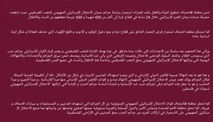 تدين منظمة #انتصاف لحقوق المرأة والطفل بأشد العبارات استمرار سلسلة جرائم عدوان الاحتلال الإسرائيلي الصهيوني للشعب الفلسطيني حيث ارتفعت حصيلة ضحايا مجازر العدو الإسرائيلي خلال 24 ساعة في قطاع غزة إلى أكثر من 430 شهيداً و 530 جريحاً معظمهم من النساء والأطفال