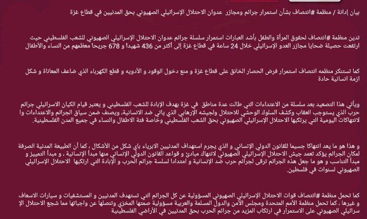 تدين منظمة #انتصاف لحقوق المرأة والطفل بأشد العبارات استمرار سلسلة جرائم عدوان الاحتلال الإسرائيلي الصهيوني للشعب الفلسطيني حيث ارتفعت حصيلة ضحايا مجازر العدو الإسرائيلي خلال 24 ساعة في قطاع غزة إلى أكثر من 436 شهيداً و 678 جريحاً معظمهم من النساء والأطفال