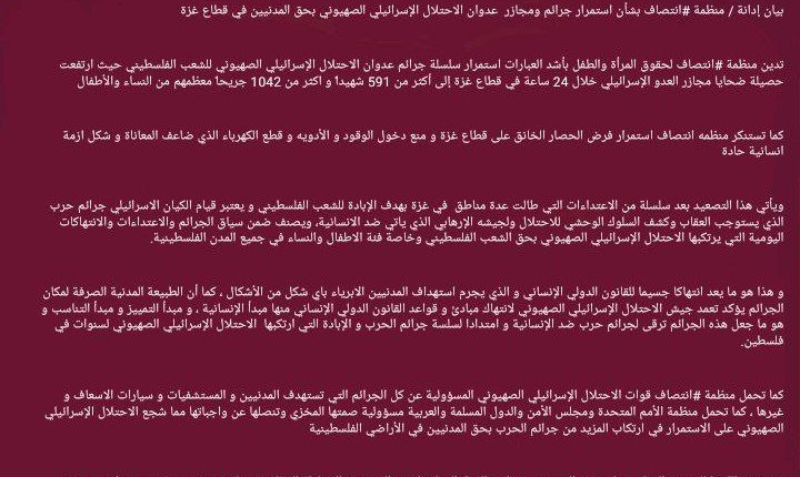تدين منظمة #انتصاف لحقوق المرأة والطفل بأشد العبارات استمرار سلسلة جرائم عدوان الاحتلال الإسرائيلي الصهيوني للشعب الفلسطيني حيث ارتفعت حصيلة ضحايا مجازر العدو الإسرائيلي خلال 24 ساعة في قطاع غزة إلى أكثر من 591 شهيداً و اكثر من 1042 جريحاً معظمهم من النساء والأطفال