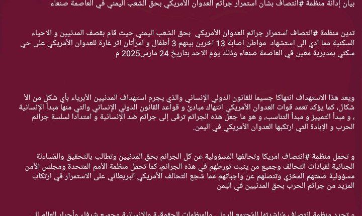 بيان إدانة منظمة #انتصاف بشأن استمرار جرائم العدوان الأمريكي بحق الشعب اليمني في العاصمة صنعاء