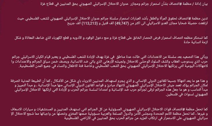 تدين منظمة #انتصاف لحقوق المرأة والطفل بأشد العبارات استمرار سلسلة جرائم عدوان الاحتلال الإسرائيلي الصهيوني للشعب الفلسطيني حيث ارتفعت حصيلة ضحايا مجازر العدو الاسرائيلي الى اكثر من (49,747) الف قتيل و (113,213) الف جريح