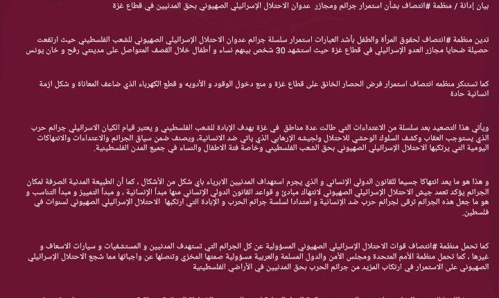 بيان إدانة / منظمة #انتصاف بشأن استمرار جرائم ومجازر  عدوان الاحتلال الإسرائيلي الصهيوني بحق المدنيين في قطاع غزة