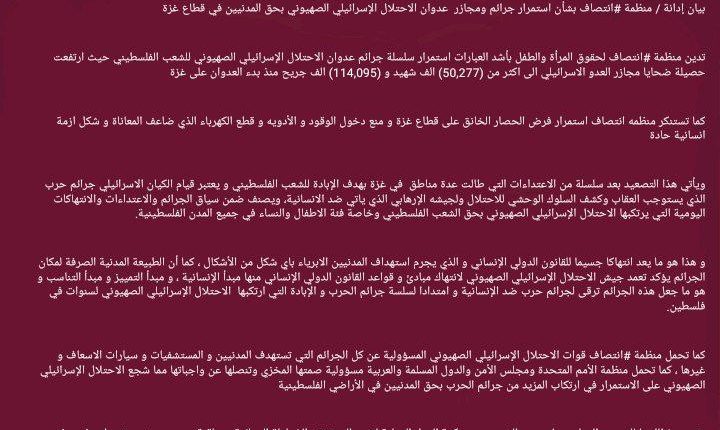 تدين منظمة #انتصاف لحقوق المرأة والطفل بأشد العبارات استمرار سلسلة جرائم عدوان الاحتلال الإسرائيلي الصهيوني للشعب الفلسطيني حيث ارتفعت حصيلة ضحايا مجازر العدو الاسرائيلي الى اكثر من (50,277) الف شهيد و (114,095) الف جريح منذ بدء العدوان على غزة