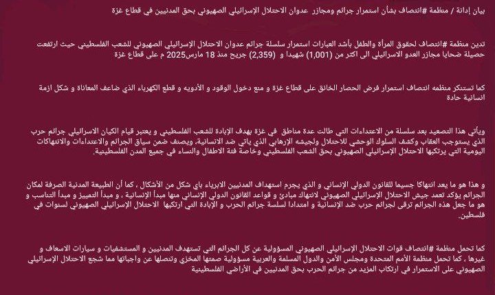 تدين منظمة #انتصاف لحقوق المرأة والطفل بأشد العبارات استمرار سلسلة جرائم عدوان الاحتلال الإسرائيلي الصهيوني للشعب الفلسطيني حيث ارتفعت حصيلة ضحايا مجازر العدو الاسرائيلي الى اكثر من (1,001) شهيدا و (2,359) جريح منذ 18 مارس 2025م على قطاع غزة