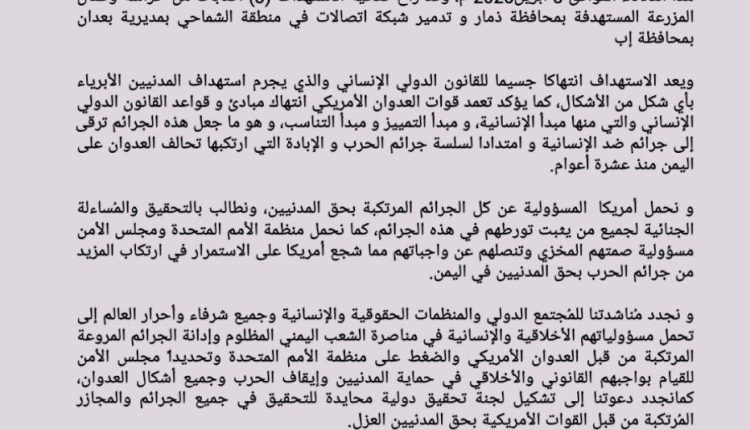 و نحمل أمريكا المسؤولية عن كُل الجرائم المرتكبة بحق المدنيين، ونطالب بالتحقيق والمُساءلة الجنائية لجميع من يثبت تورطهم في هذه الجرائم، كما نحمل منظمة الأمم المتحدة ومجلس الأمن مسؤولية صمتهم المخزي وتنصلهم عن واجباتهم مما شجع أمريكا على الاستمرار في ارتكاب المزيد من جرائم الحرب بحق المدنيين في اليمن.