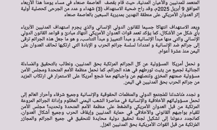 ندين ونستنكر بأشد العبارات استمرار جرائم العدوان الأمريكي بحق الشعب اليمني من خلال قصفه المتعمد للمدنيين والأعيان المدنية، حيث قام بقصف العاصمة صنعاء في مساء يومنا هذا الأربعاء الموافق 9 أبريل 2025م، وقد راح ضحية الاستهداف (3) شهداء و عدد من الجرحى كحصلية أولية إثر العدوان الأمريكي على منطقة النهدين بمديرية السبعين بالعاصمة صنعاء