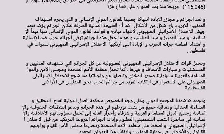 ونجدد مُناشدتنا للمجتمع الدولي وعلى وجه الخصوص محكمة العدل الدولية لفتح التحقيق والمُساءلة الجنائية ومعاقبة جميع من يثبت تورطهم في هذه الجرائم وندعو المنظمات الحقوقية والإنسانية وجميع الدول المسلمة والعربية و شرفاء وأحرار العالم إلى تحمل مسؤولياتهم الأخلاقية والإنسانية في مناصرة الشعب الفلسطيني المظلوم وإدانة الجرائم المروعة المرتكبة من قبل الاحتلال الإسرائيلي الصهيوني والضغط على منظمة الأمم المتحدة وتحديداً مجلس الأمن للقيام بواجبهم القانوني والأخلاقي في حماية المدنيين وإيقاف هذا العدوان المتعمد