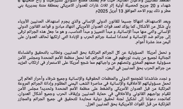 و نجدد مُناشدتنا للمُجتمع الدولي والمنظمات الحقوقية والإنسانية وجميع شرفاء وأحرار العالم إلى تحمل مسؤولياتهم الأخلاقية والإنسانية في مناصرة الشعب اليمني المظلوم وإدانة الجرائم المروعة المرتكبة من قبل العدوان الأمريكي والضغط على منظمة الأمم المتحدة وتحديداً مجلس الأمن للقيام بواجبهم القانوني والأخلاقي في حماية المدنيين وإيقاف الحرب وجميع أشكال العدوان، كمانجدد دعوتنا إلى تشكيل لجنة تحقيق دولية محايدة للتحقيق في جميع الجرائم والمجازر المُرتكبة من قبل القوات الأمريكية بحق المدنيين العزل.