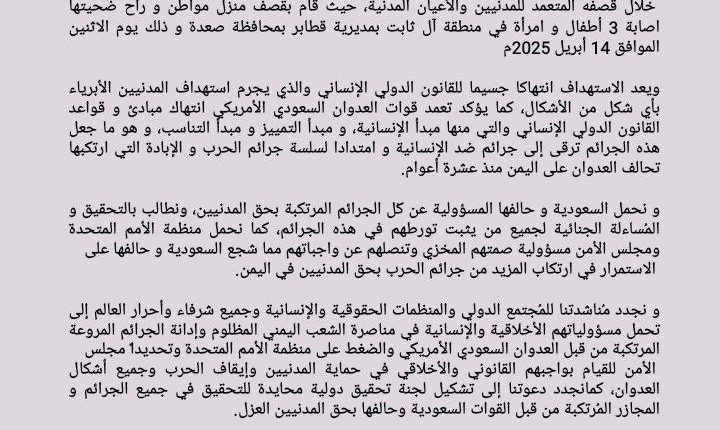 ندين ونستنكر بأشد العبارات استمرار جرائم العدوان السعودي الأمريكي بحق الشعب اليمني من خلال قصفه المتعمد للمدنيين والأعيان المدنية، حيث قام بقصف منزل مواطن و راح ضحيتها اصابة 3 أطفال و امرأة في منطقة آل ثابت بمديرية قطابر بمحافظة صعدة و ذلك يوم الاثنين الموافق 14 أبريل 2025م