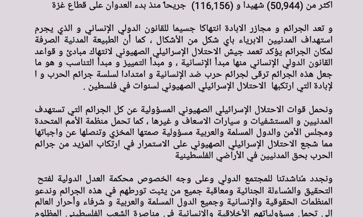 ونجدد مُناشدتنا للمجتمع الدولي وعلى وجه الخصوص محكمة العدل الدولية لفتح التحقيق والمُساءلة الجنائية ومعاقبة جميع من يثبت تورطهم في هذه الجرائم وندعو المنظمات الحقوقية والإنسانية وجميع الدول المسلمة والعربية و شرفاء وأحرار العالم إلى تحمل مسؤولياتهم الأخلاقية والإنسانية في مناصرة الشعب الفلسطيني المظلوم وإدانة الجرائم المروعة المرتكبة من قبل الاحتلال الإسرائيلي الصهيوني والضغط على منظمة الأمم المتحدة وتحديداً مجلس الأمن للقيام بواجبهم القانوني والأخلاقي في حماية المدنيين وإيقاف هذا العدوان المتعمد