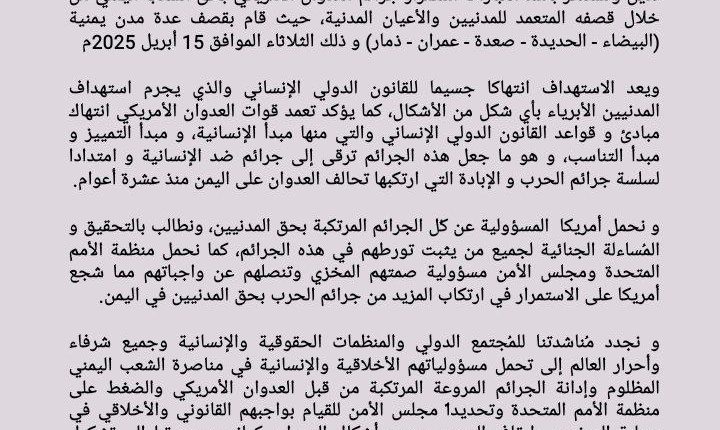 ندين ونستنكر بأشد العبارات استمرار جرائم العدوان الأمريكي بحق الشعب اليمني من خلال قصفه المتعمد للمدنيين والأعيان المدنية، حيث قام بقصف عدة مدن يمنية (البيضاء – الحديدة – صعدة – عمران – ذمار) و ذلك الثلاثاء الموافق 15 أبريل 2025م